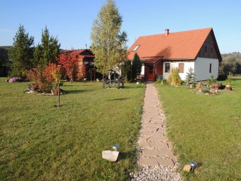 | Ubytování a okolí | 2 osoby jsou ubytovány v romantické chatce stylově vybavené 30. léta min.století s kamny i elektrickým topením, 5 metrů od hlavní budovy bez příslušenství. 2 osoby v otevřeném patře hlavní budovy, dvě samostatná WC s umyvadly a skříňkami a věšáky v hlavní budově a jedna samostatná sprcha v masérské místnosti.Velká společenská místnost krbem a se vstupem na terasu s výhledem na Pojizeří. Ve společenské místnosti je též bylinný parní box.Místnost je profesionálně ozvučena. Dřevostavba je na téměř hektarovém pozemku pod hradem Trosky v srdci Českého ráje na hlavní turistické trase 5 minut od želez.stanice Borek pod Troskami, nedaleko lesního rybníka s možností koupání. Poblíž zámku Hrubá Skála. |